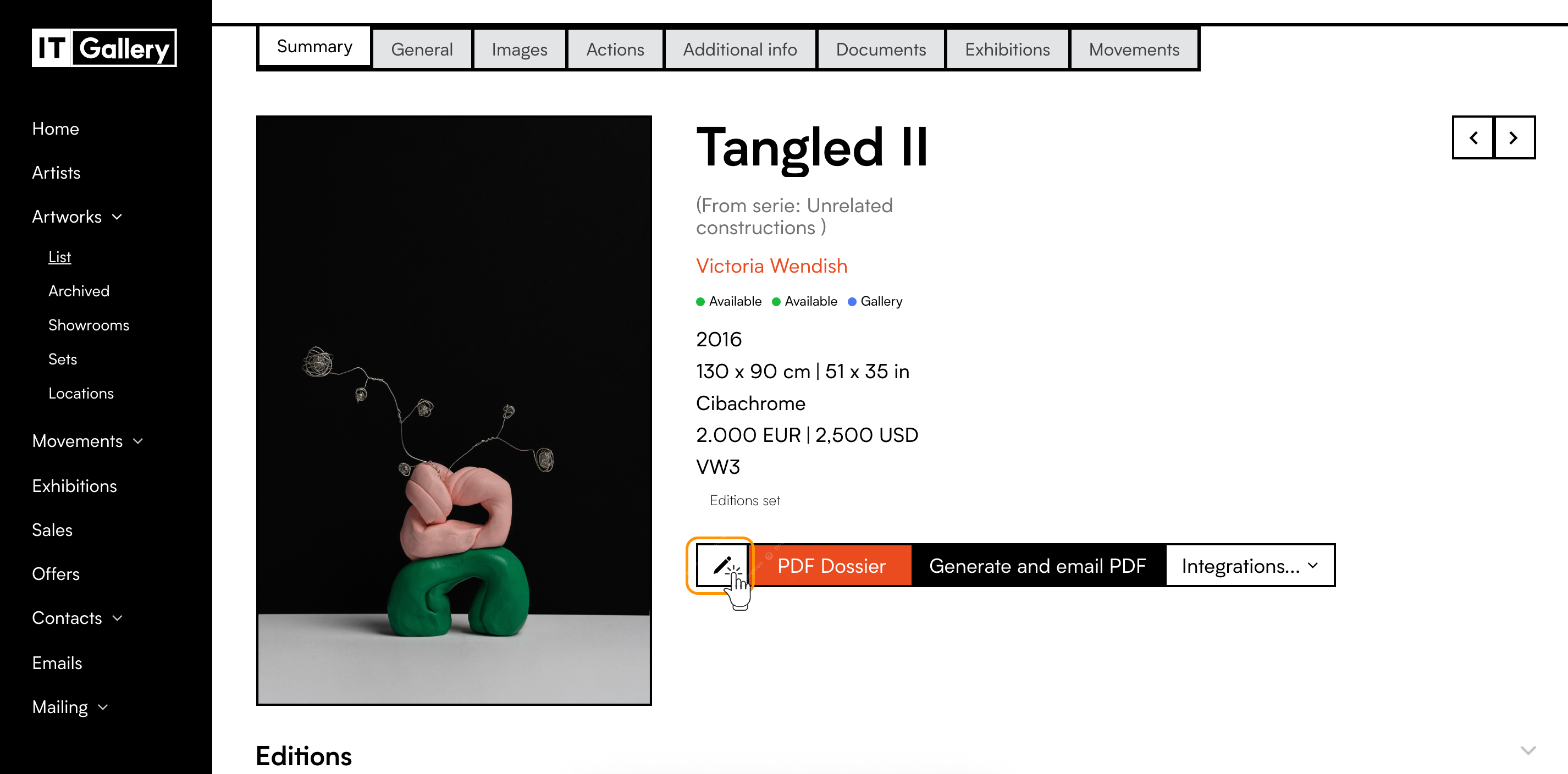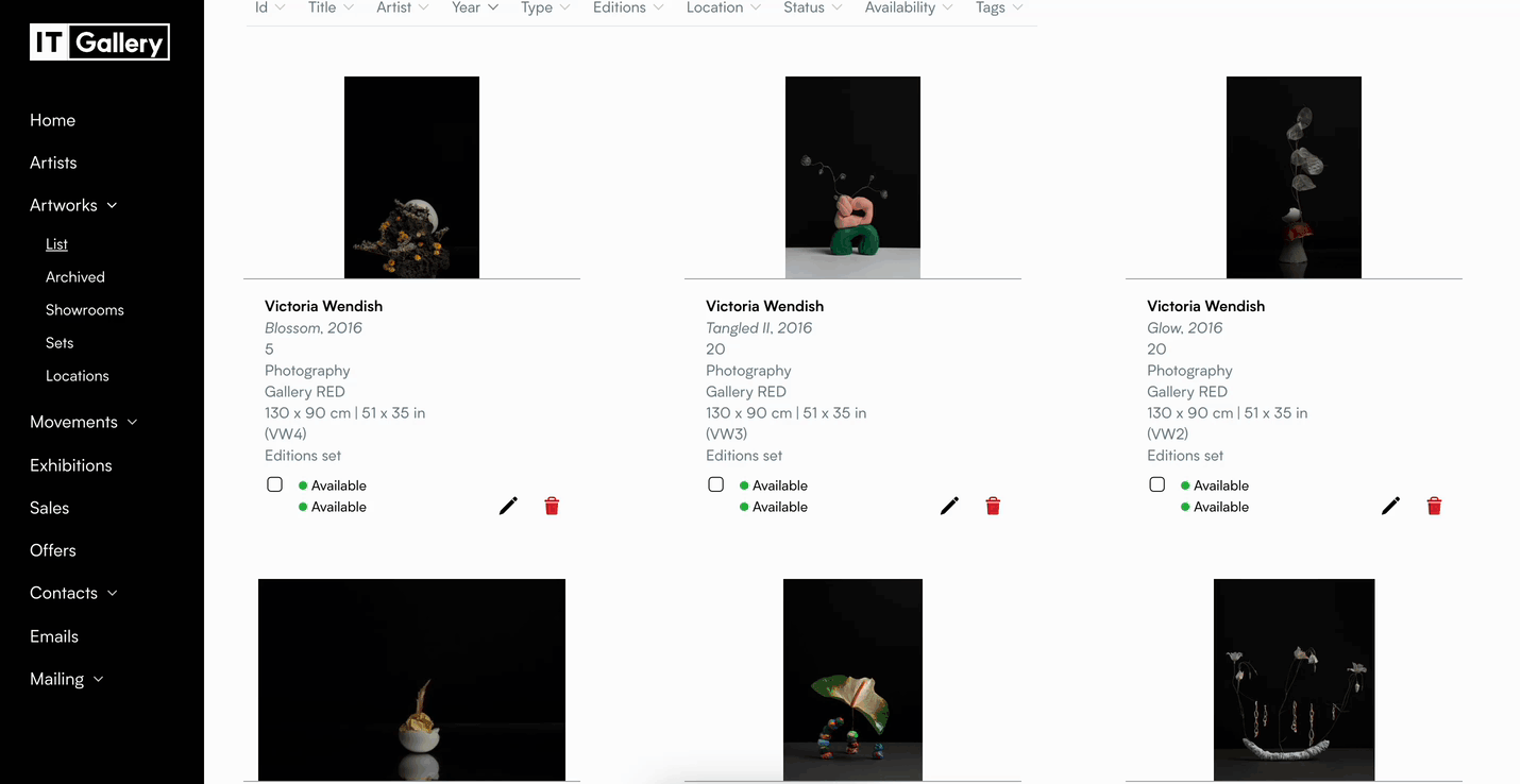 - Under 'List' (both, in 'list' and 'grid' visualization modes), place the cursor over the artwork you need to modify and click on the 'Edit' button, that is the pencil-shaped icon