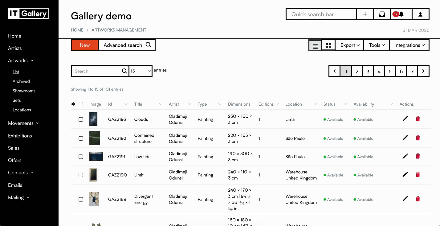 'Collections' constitutes a submenu within the 'Artworks' module. It allows you to create groups of works under the same criteria. It can be used to group by themes, price ranges or any other criteria you need. *