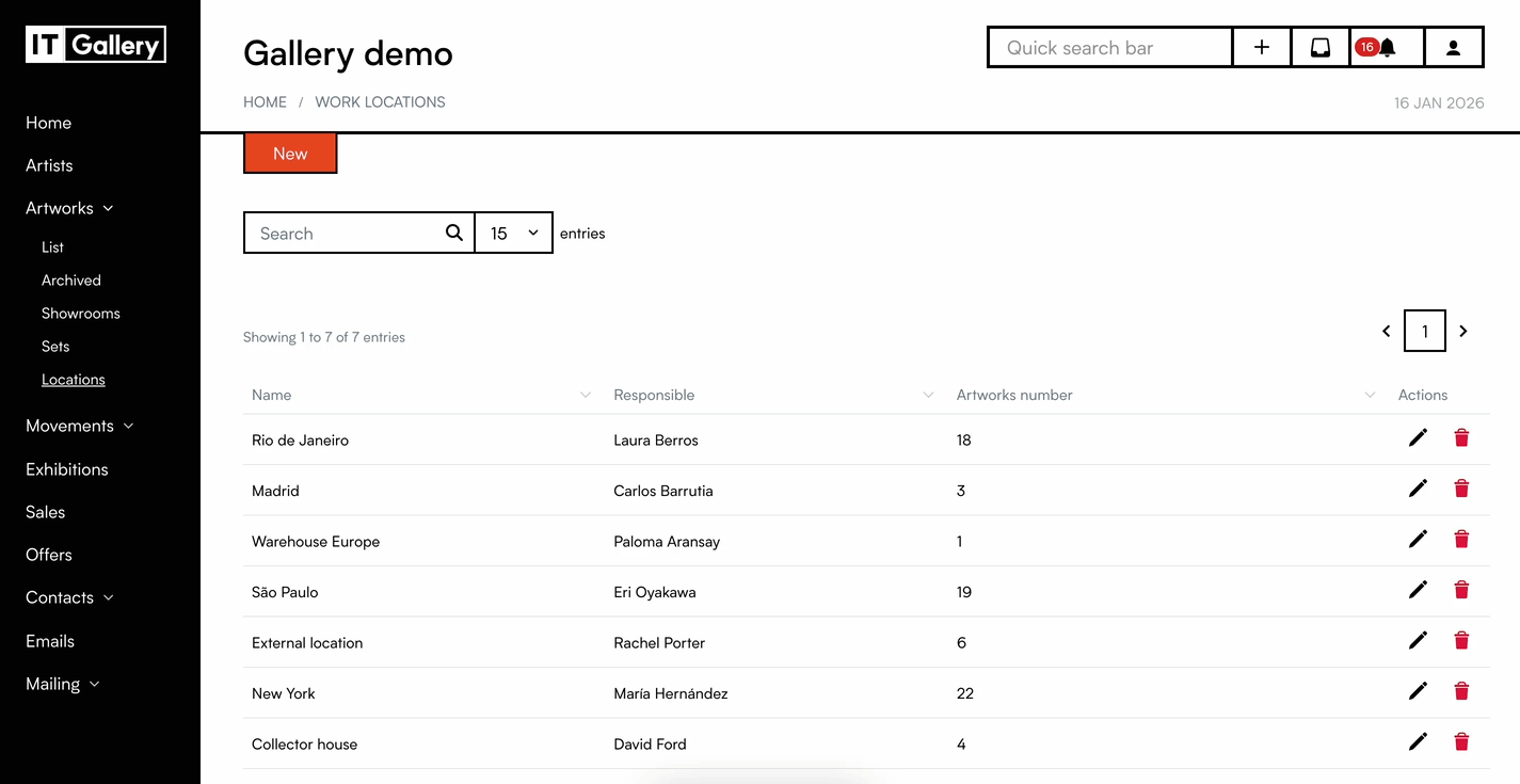 'Locations' is a submenu inside the 'Artworks' module. It allows you to see every location you work with and how your collection is distributed amongst them. Furthermore, every location offers additional information such a place description, person in charge and address.