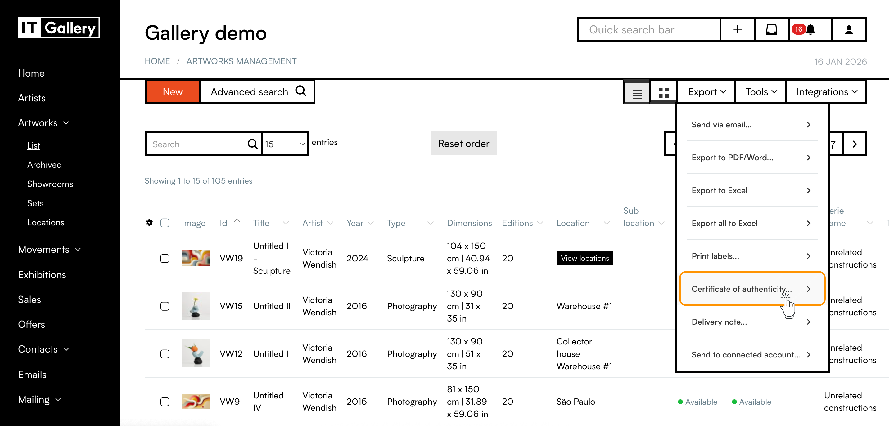For doing so: Artworks > List > Select artwork(s)(checking the white box) > Export > Certificate of authenticity/Delivery note