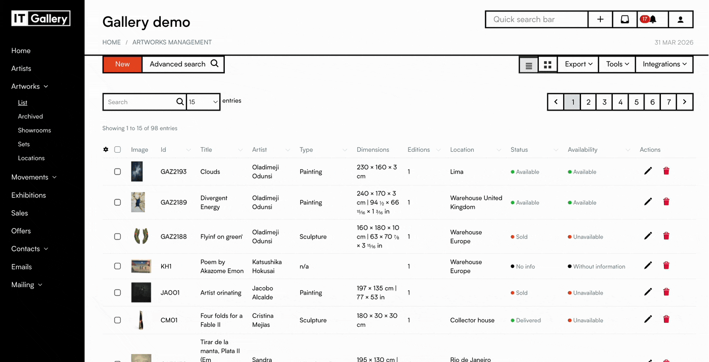 - Under the 'Artworks' module, within 'List' (both in 'list' and 'grid' modes), select the work or works that you want to delete, checking the white box