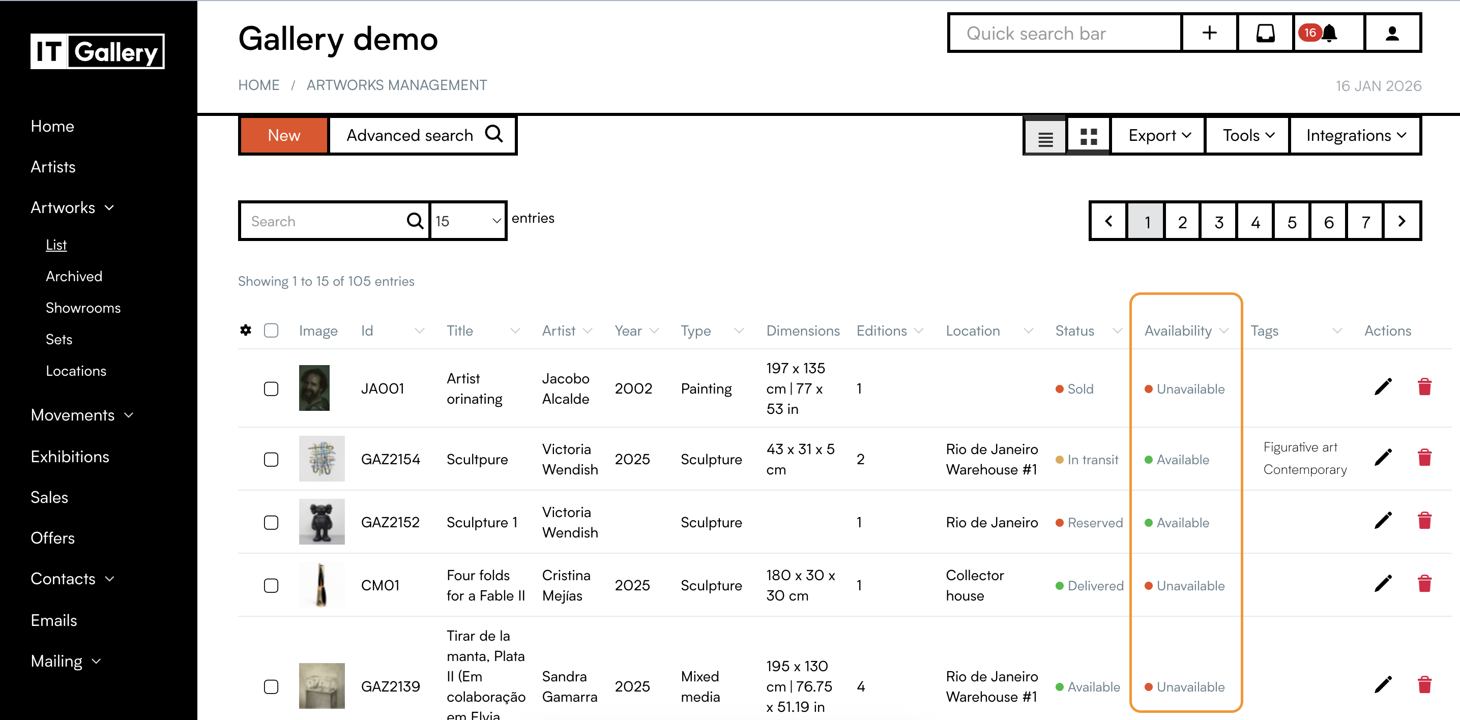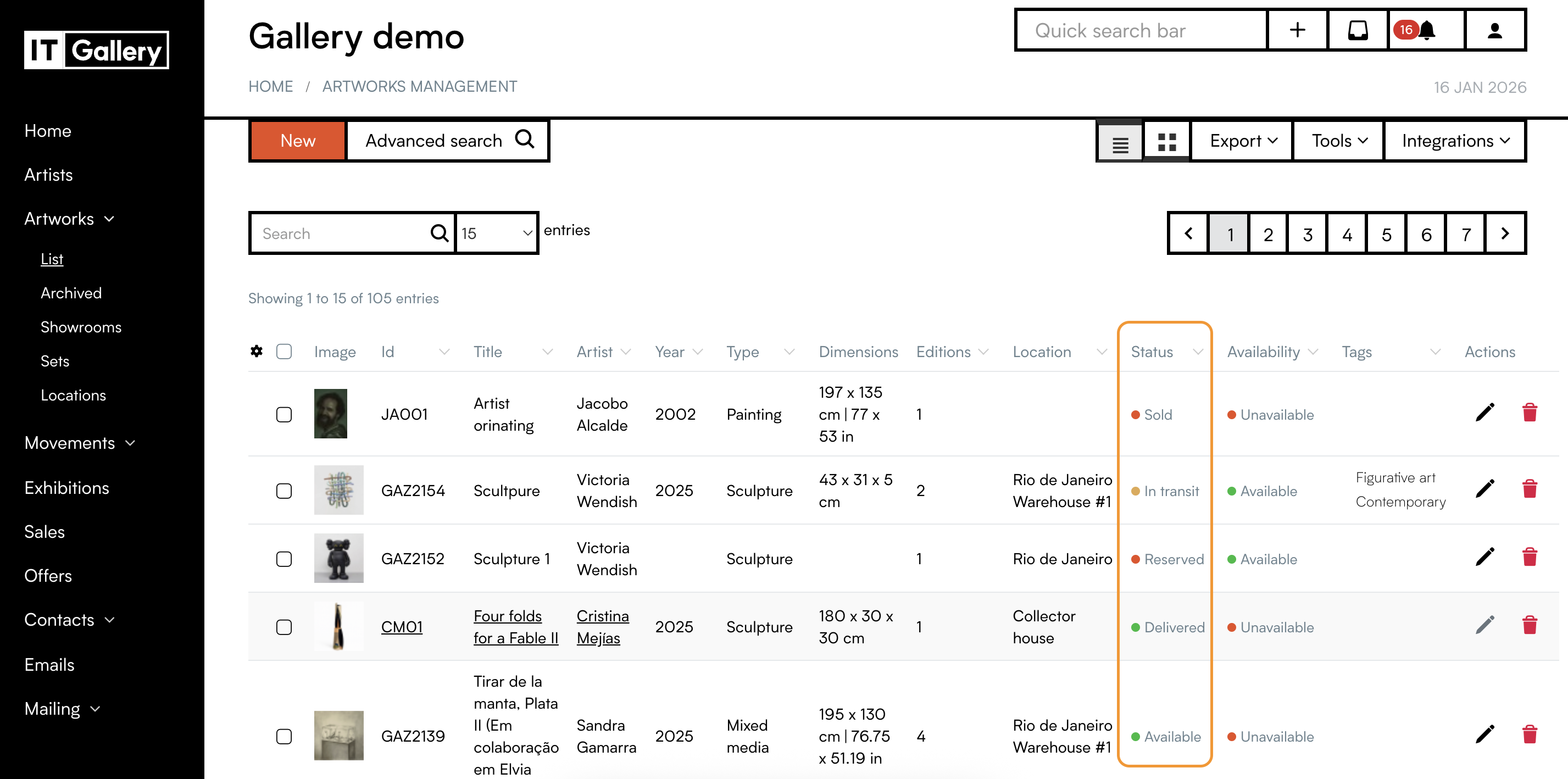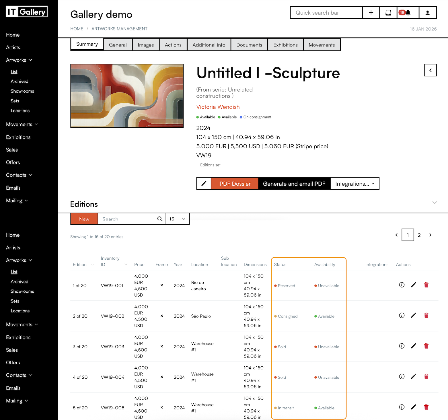 The 'artwork status' is a field that provides information about the situation of the artwork: available, reserved, being restored, sold, not available, etc. Statuses are associated with a specific colour for making easier its identification.*
