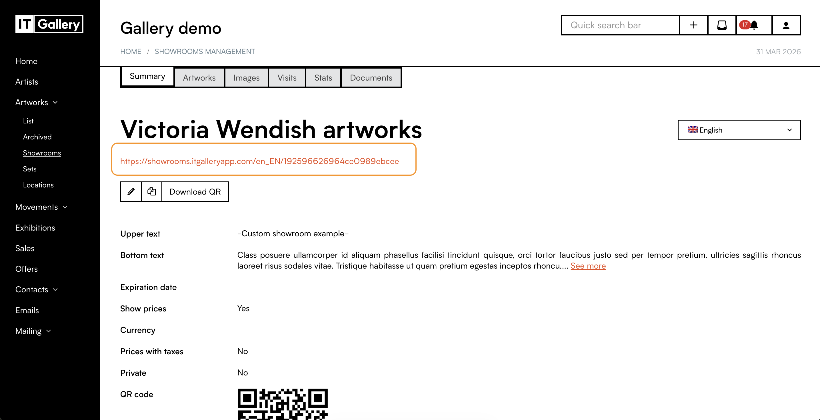 - Under the 'Artworks' module go to the 'Showrooms' submenu