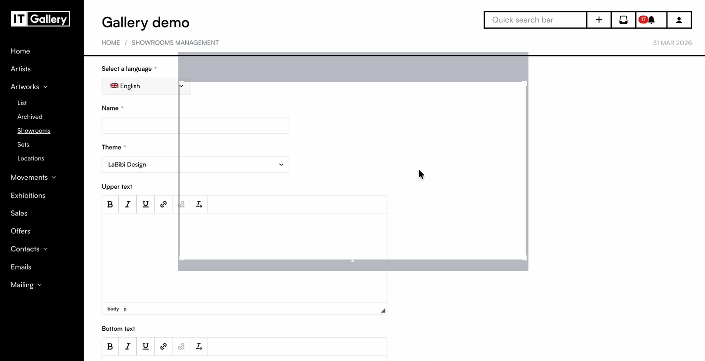 - Showrooms > New > Edit the corresponding fields > New showroom