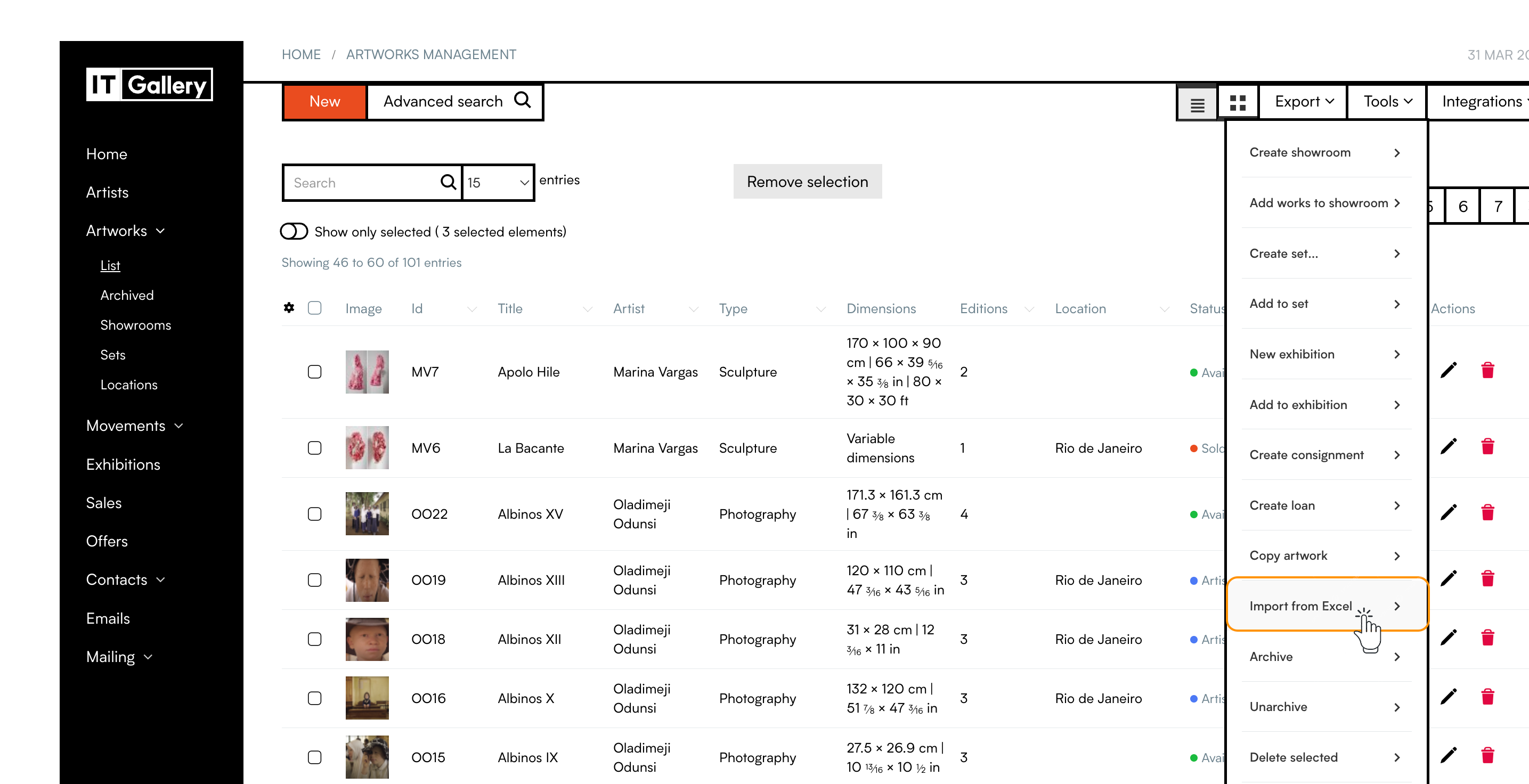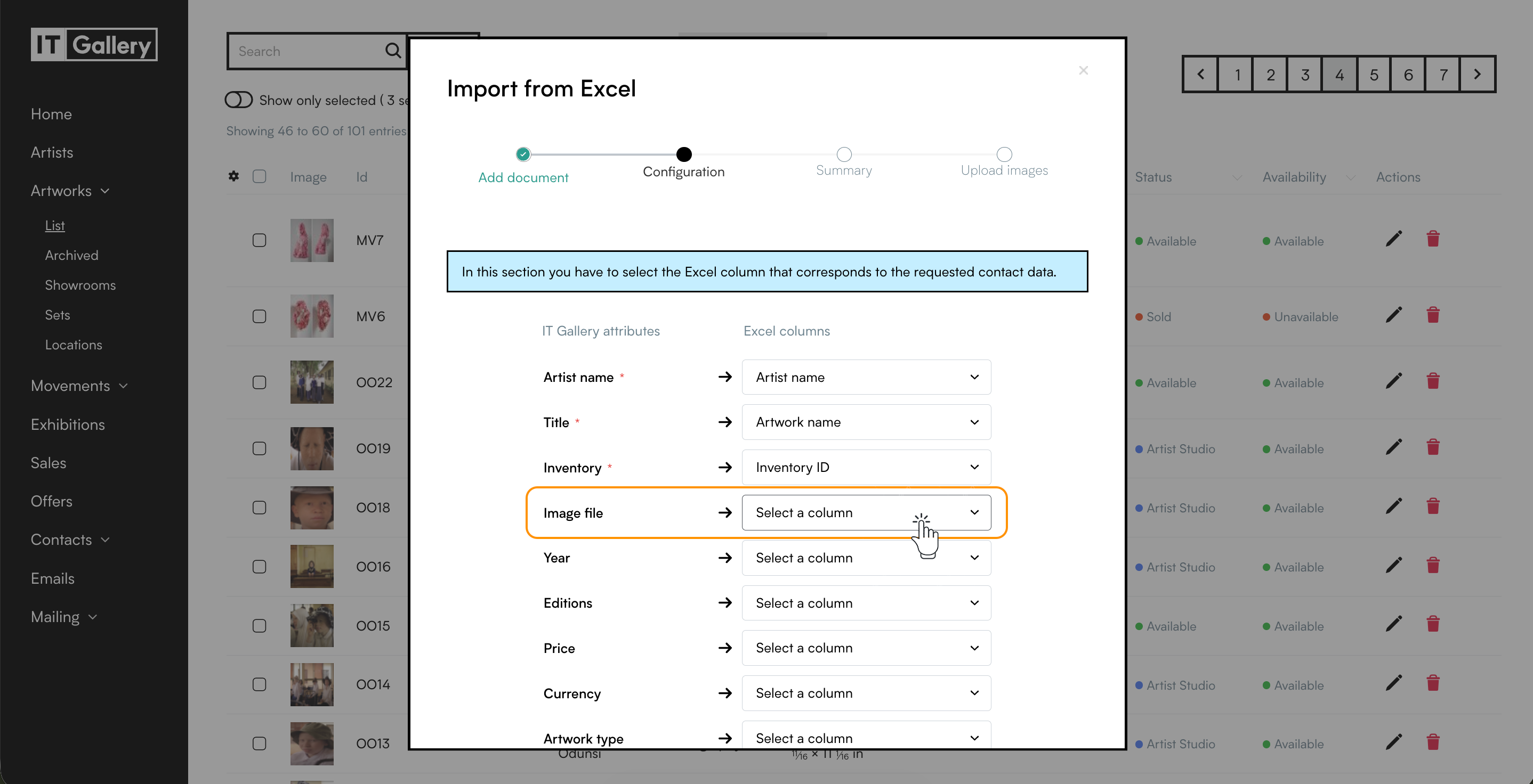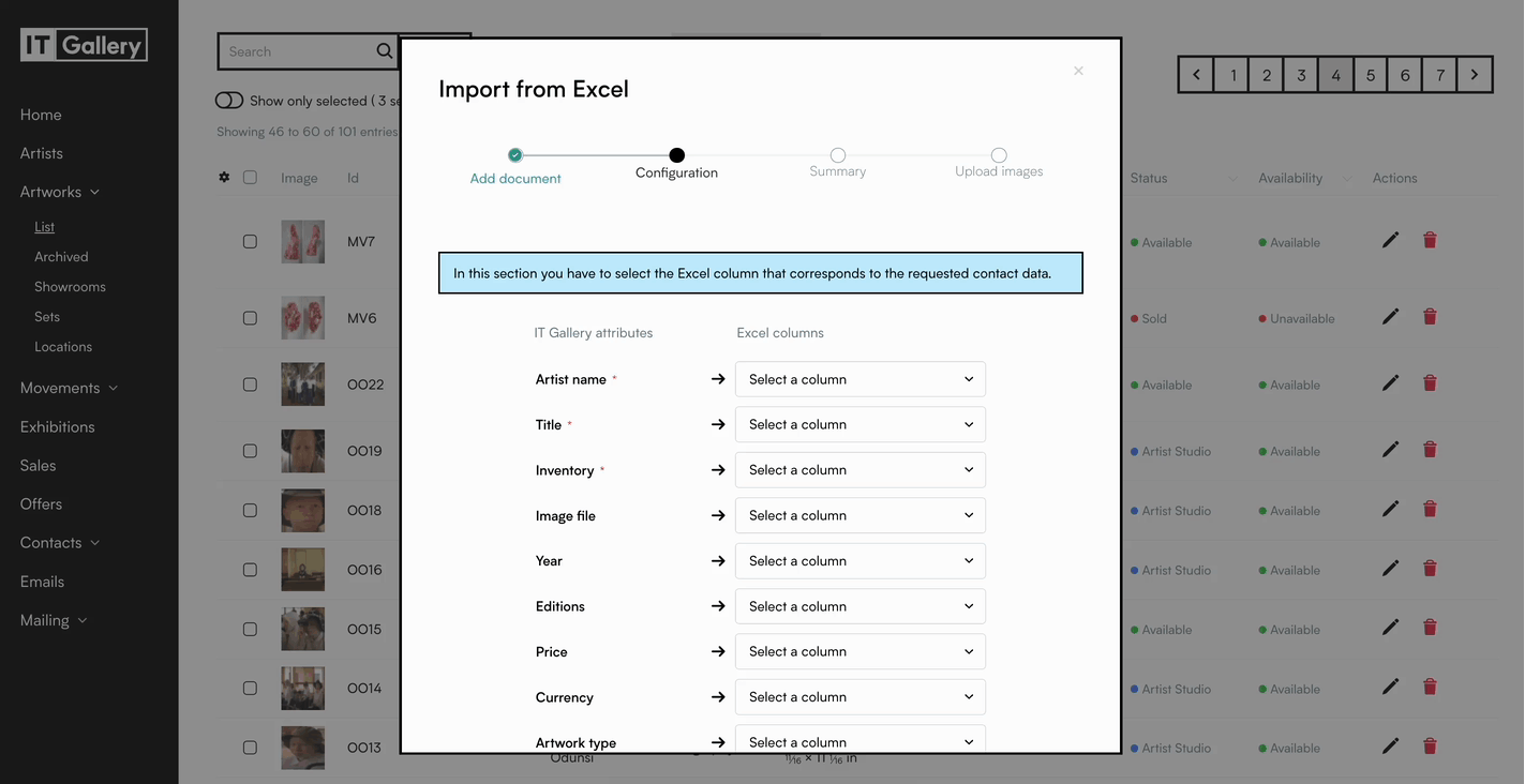 ITGallery allows you to import multiple artworks at once through an Excel file. This is ideal for quickly uploading large inventories and ensuring all your data is accurately structured. You can import up to 200 artworks per file.